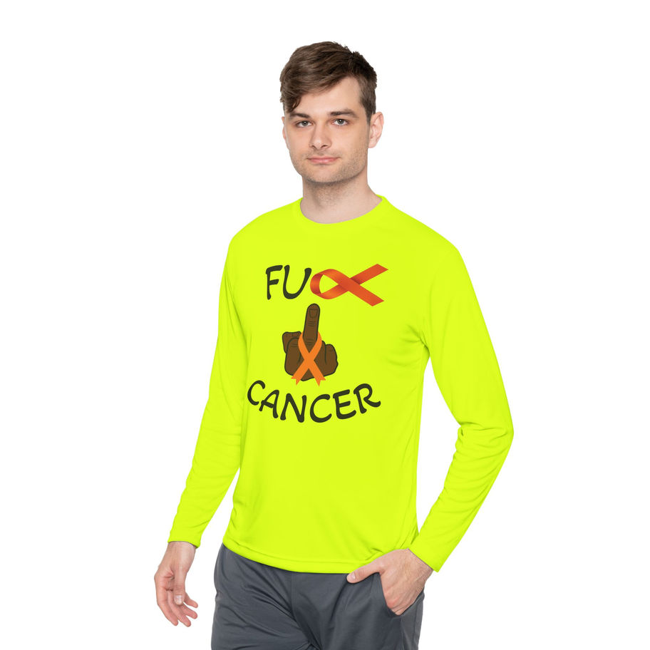 A cancer awareness long sleeve tee, featuring a design of a middle finger with a cancer ribbon around it, emphasizing the message FU* Cancer. This tee is perfect for those looking to promote cancer awareness and make a statement. Ideal for individuals passionate about supporting cancer patients, survivors, or those affected by the disease. Suitable for wearing during cancer awareness events, fundraisers/walks or any outings. This tee is also ideal for active individuals, making it a great option for workouts or leisurely days out. Its moisture-wicking properties ensure you stay cool and dry, whether you’re running errands or enjoying a sunny day at the park. Customizable ribbon color to represent a specific cancer; as well as, customizable hand color.
