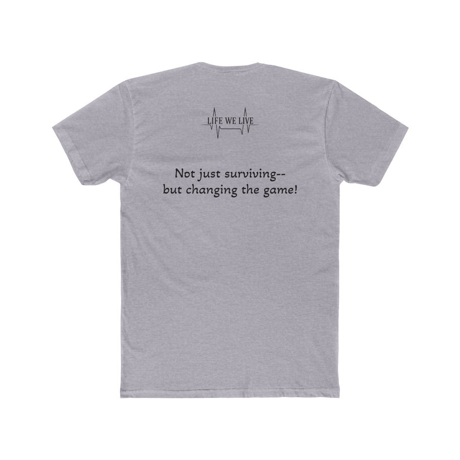 On the back, the message continues — highlighting 'the life we live' motto and reminding the world that you’re not just surviving… you’re changing the game.